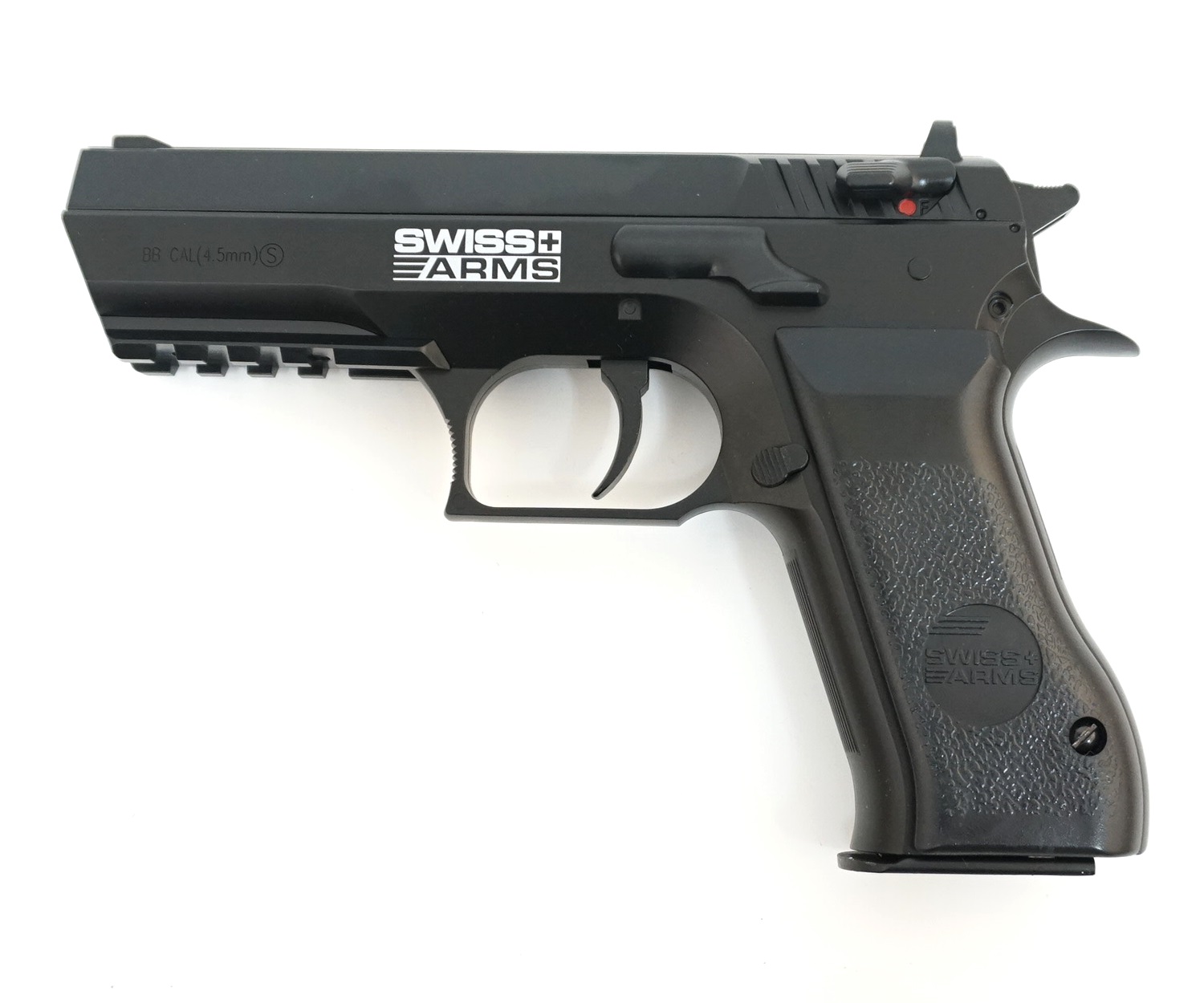 Эта модель довольно хорошо и надежно лежит в руке. Имеет удобные, контрастные прицельные приспособления. Достоинство Swiss Arms 941 — высокая стартовая скорость шарика: 135 м/с, нормальная вместительность магазина: двадцать два шарика, а также его увесистость и надежность. В комплекте с пистолетом идет: шестигранник для зажима баллона, стандартный комплект шариков и ускоритель заряжания магазина.