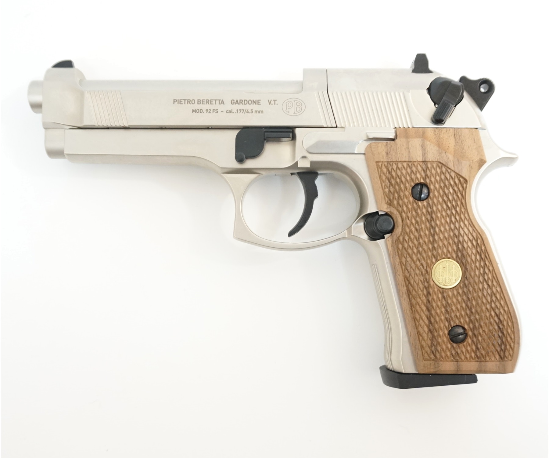Модель Umarex Beretta 92 FS (никель, дерево) сделана из металла, у неё матовое никелированное покрытие, потому смотрится очень красиво и солидно. Точность стрельбы повышает нарезной высококачественный ствол, хорошо настроенный прицел, большая масса (1,26 кг), а также лёгкий спуск в случае стрельбы с предварительного взвода. Конечно, данная пневматическая модель пистолета не только по массе сходна с легендарной Береттой, а и по внешним данным абсолютно копирует свой огнестрельный прототип.
