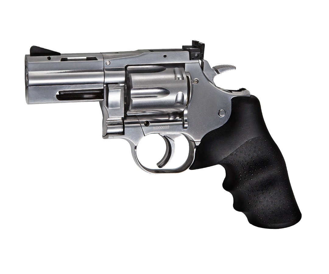 Dan Wesson 715-2,5 Silver пневматического типа имеет стандартный открытый прицельный механизм, наличие направляющей на стволе позволяет установить планку Вивера для использования дополнительных стрелковых аксессуаров. Дан Вессон 715-2,5 изготовлен из металлического сплава отличного качества, ствол револьвера серебристый, накладки на рукоятке имеют шероховатую поверхность, и выполнены из пластика. При длине в 29,8 см револьвер весит немного – всего 1,22 кг. Комплектация включает ускоритель заряжания, шесть фальш-патронов и инструкцию.