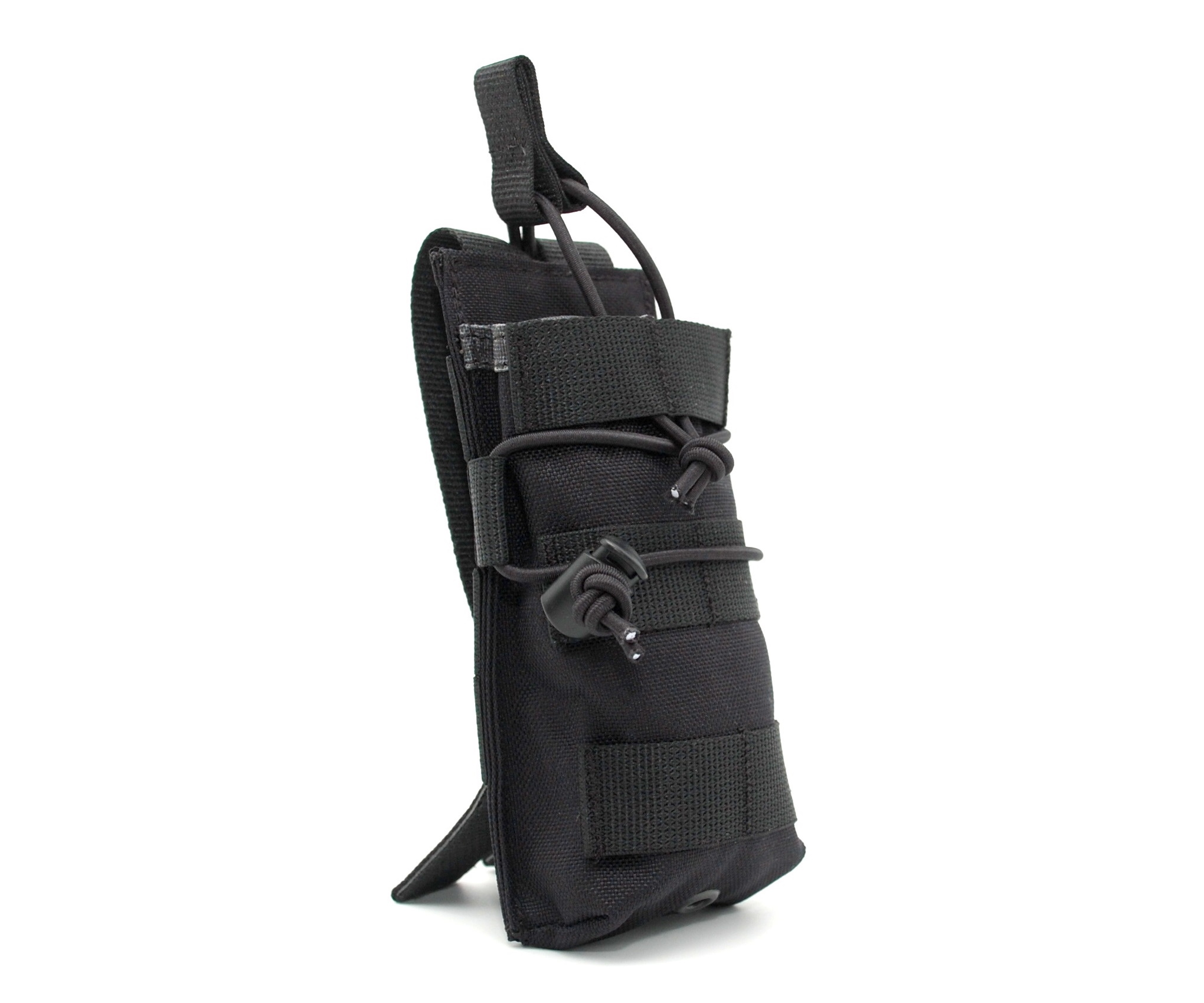 Магазин фиксируется с помощью резинки с хлястиком, что обеспечивает быстрое извлечение и защищает от утери. Так же возможно размещение на обычном ремне. Доступен в различных цветах, данный вариант в черном цвете.
