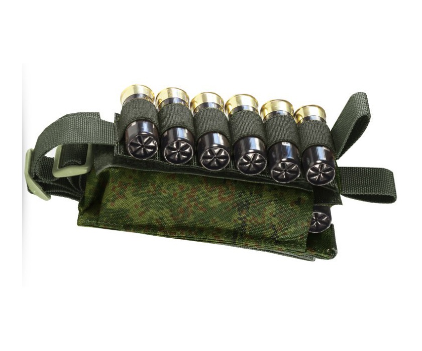 Патроны фиксируются плотными резинками, и исключают их утерю, тем не менее оставляя к ним оперативный доступ. Возможно размещение на обычном ремне. Доступен в различных цветах, данный вариант в цвете камуфляж.