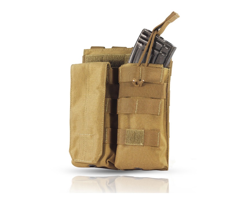 Подсумок оснащен вариативной системой закрывания: на клапан с липучкой, либо с помощью резинки. Так же оснащен утягивающей вокруг резинкой, что надежно защищает магазин от утери. Заправив клапан внутрь подсумка, допустимо его использование как открытого. Возможно размещение на обычном ремне. Доступен в различных цветах, данный вариант в цвете койот.