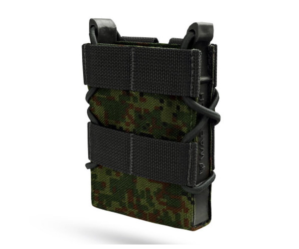 Оснащен внешними стропами MOLLE и позволяет разместить на нем дополнительное снаряжение. Имеет компактный размер. Объем подсумка настраивается с помощью резинки которая регулирует степень сжатия пластиковой вставки, что надежно защищает магазин от утери. Возможно размещение на обычном ремне. Доступен в различных цветах, данный вариант в цвете камуфляж.