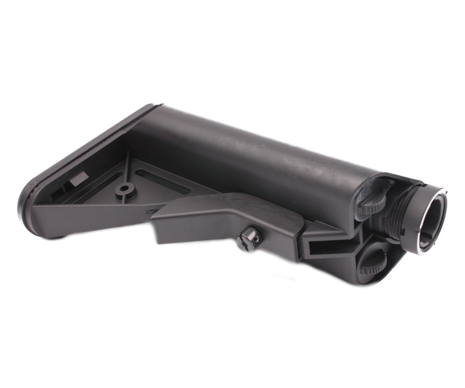Специальный приклад телескопического вида для страйкбольных приводов M4/M16. Обладает шестью положениями длины. Основа такого изделия изготовлена из особого металла. Приклад сделан из очень надежного пластика. Внутри него есть специальные ячейки с целью размещения аккумулятора по типу CQB (или же коротких типа АК). В комплекте есть нужный крепеж.