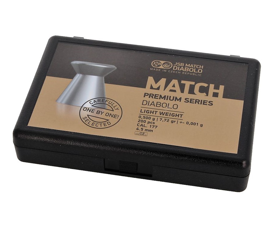 Пули JSB Match Premium Light калибра 4,5 мм — это качественные пули для спортивной стрельбы. Плоская головная часть позволяет оставить ровные круглые отверстия в мишенях, чтобы было проще определять и сравнивать результаты. JSB Match Premium Light отлично подходят для стрельбы на дистанцию до 10 метров, дальше пуля дестабилизируется. В банке 200 штук. Минимальные допуски по массе и форме, дефектные образцы отбраковываются. Форма головной части плоская. Масса пули 0,475 грамм.