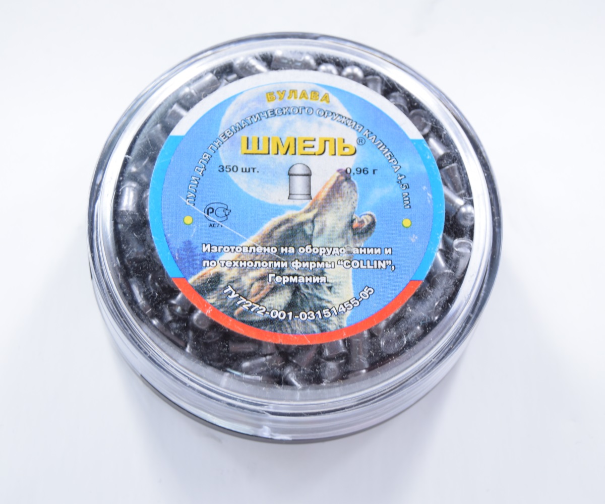 Пули Шмель «Булава» калибра 4,5 мм — штампованные свинцовые пули с полусферической головной частью. Тяжелые свинцовые пули для охоты из мощной пневматики. Обладают отличными баллистическими характеристиками. В упаковке 350 штук, средний вес 0,96 грамм.