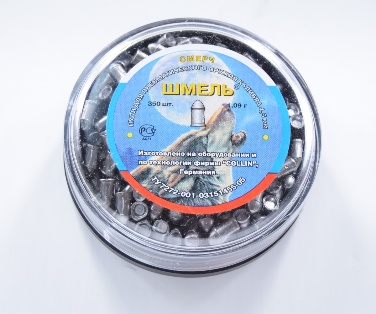 Пули Шмель «Смерч» калибра 4,5 мм — штампованные свинцовые пули с полусферической головной частью. Тяжелые свинцовые пули для охоты из мощной пневматики. Обладают отличными баллистическими характеристиками. В упаковке 300 штук, средний вес 1,09 грамм.