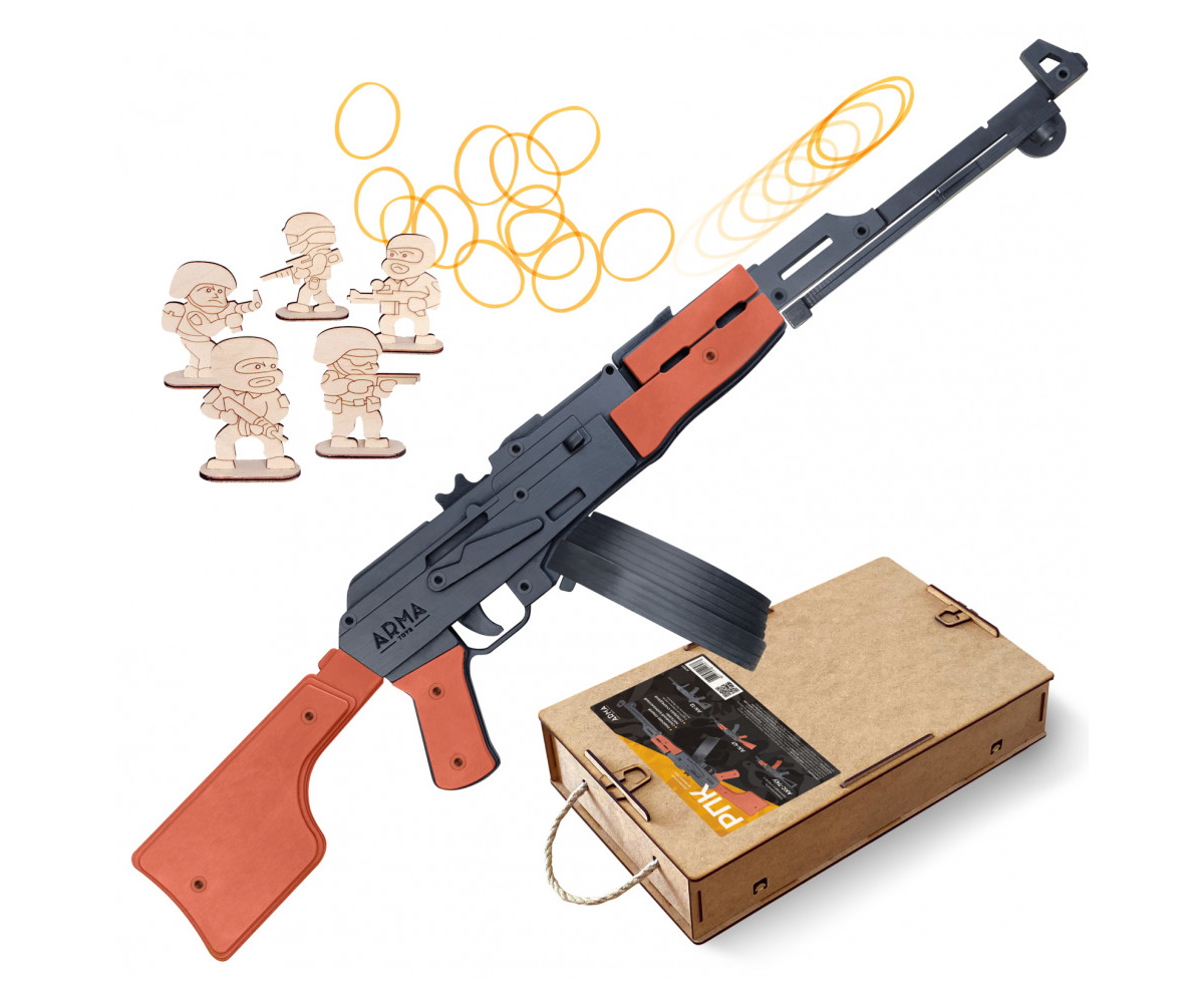 Перед вами стилизованная копия ручного пулемета Калашникова (РПК) в формате игрушки-резинкострела. Сделана она из дерева и стреляет очередями.