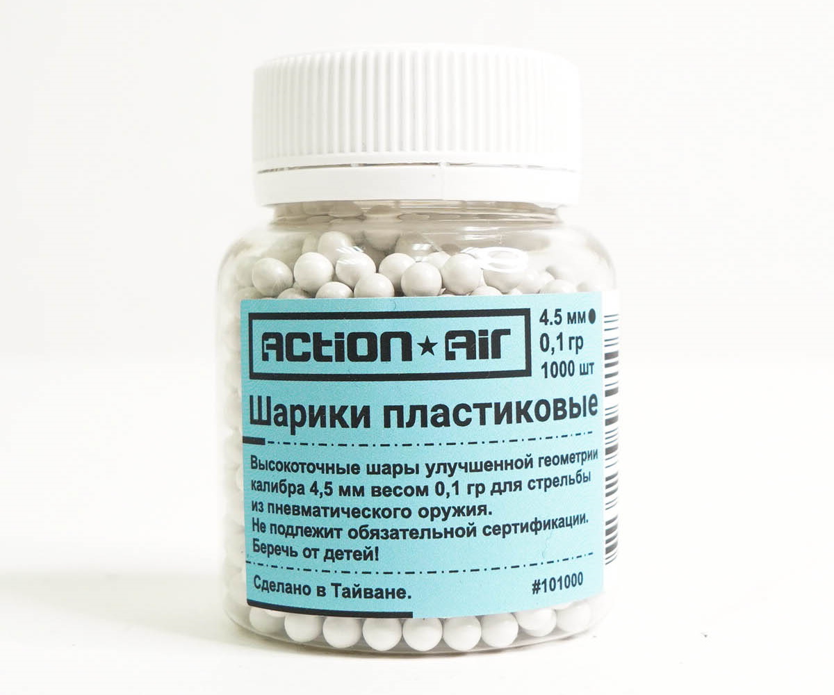 Шарики BB Action Air представляют собой пластиковые шарики весом 0,10 грамм, используемые для стрельбы из пневматических пистолетов калибра 4,5 мм. В упаковке 1000 шариков.
