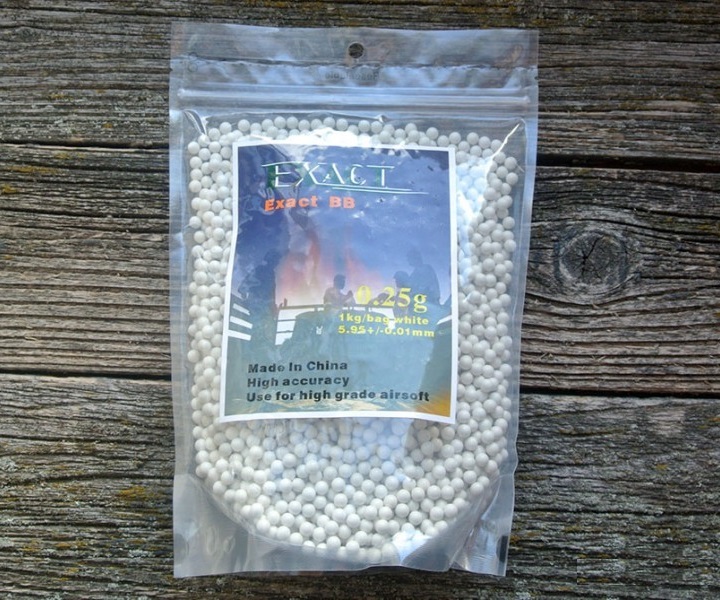 Пластиковые шарики калибром 6 мм Exact весом 0,25 граммов предназначены для стрельбы из страйкбольных пистолетов и винтовок. В упаковке примерно 4000 штук, 1 килограмм. Диаметр 5,95 мм, погрешность в диаметре этих шариков составляет всего 0,01 мм.