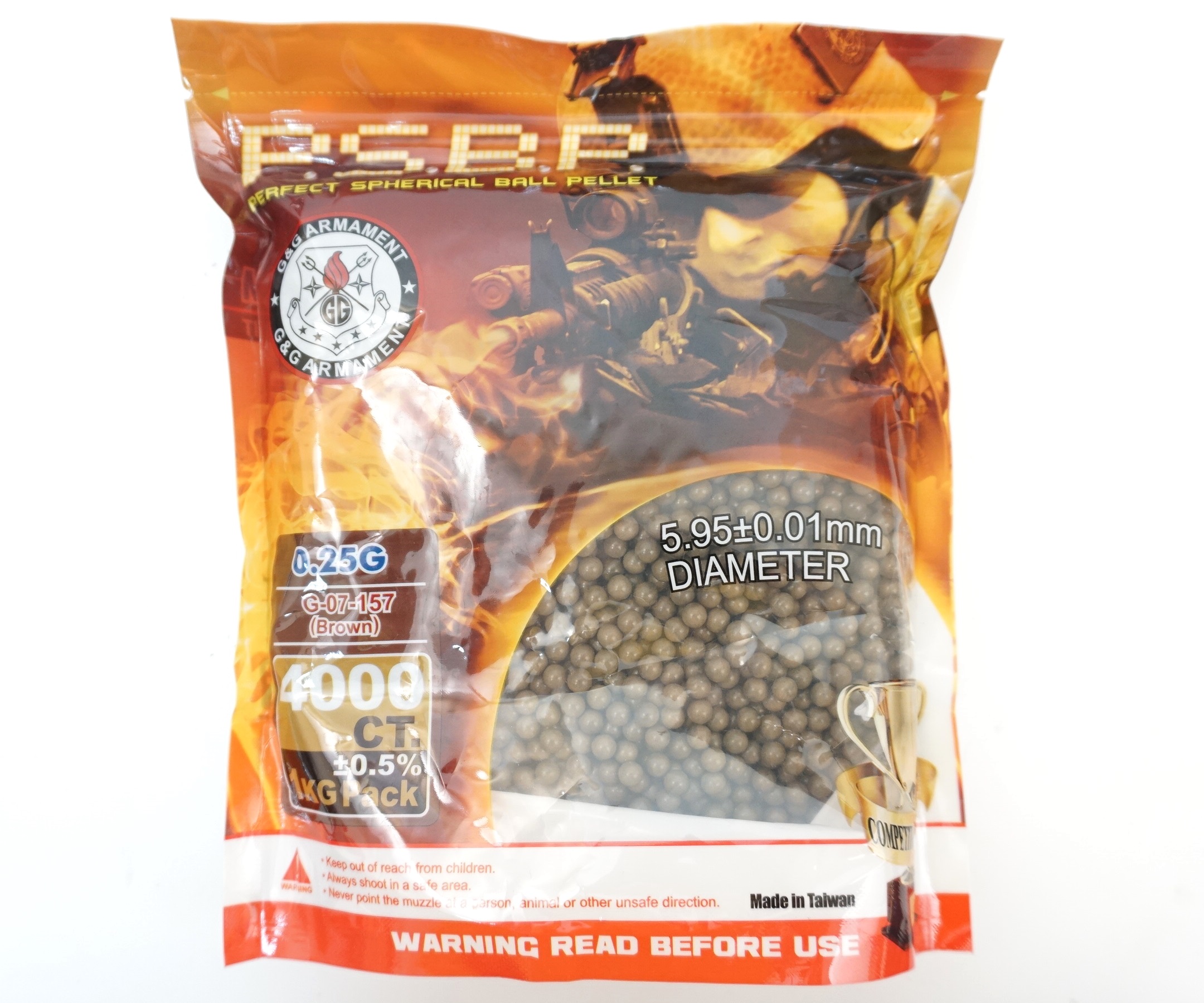 Шары G&G Perfect калибра 6 мм, коричневого цвета, с массой 0,25 грамм отлично подходят для стрельбы из страйкбольных пистолетов и приводов со средней начальной скоростью вылета шарика (примерно 110-120 м/с). В упаковке примерно 4000 штук, 1 килограмм. Диаметр 5,95 мм, погрешность в диаметре этих шариков составляет всего 0,01 мм.