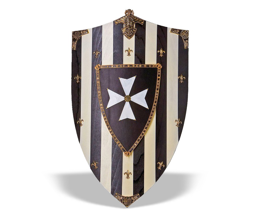 Щит Госпитальера (Wooden Shield of the Knights Hospitalier) изготовлен из прочной древесины, окрашенный в контрастные полосы черного и белого цветов, с геральдическим символом Госпитальера рыцарей (также известный как рыцари Мальты).