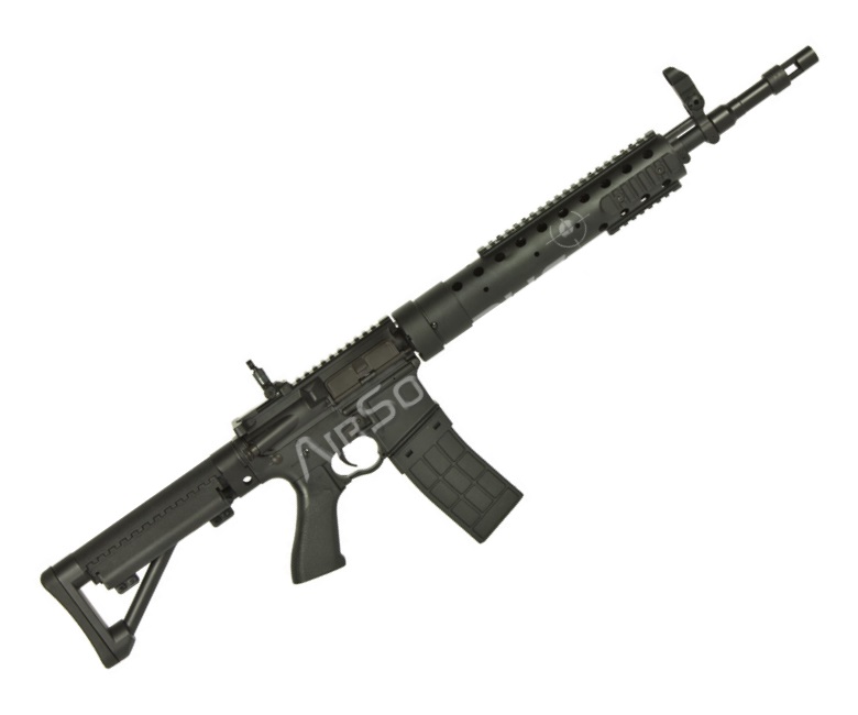 Корпус винтовки выполнен из сплава алюминия, часть компонентов – из пластика ABS. Цевье алюминиевое, на нем установлены сразу четыре ris-планки для дополнительных стрелковых аксессуаров. Приклад складной, шестипозиционный, позволяет установить его оптимальную для стрелка длину. Приклад оснащен двумя затыльниками. Установлен механический прицел в виде диоптрического складного целика и мушки – аналогично огнестрельному прототипу.