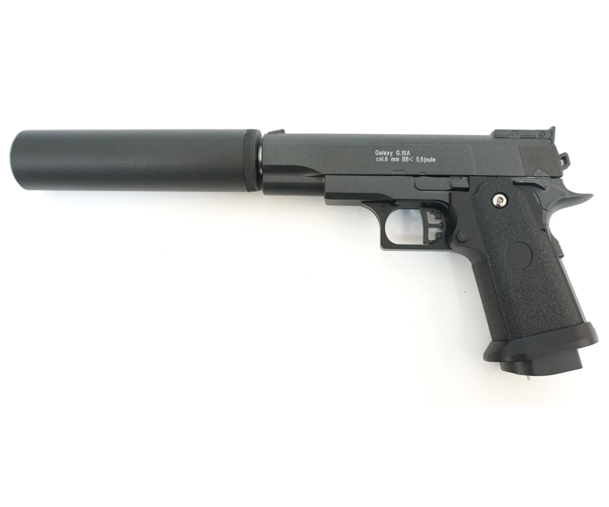 Galaxy G.10A — качественная спринговая страйкбольная модель пистолета Colt 1911 с имитацией глушителя, изготовленная из качественного цинкового сплава и пластика. Начальная скорость выстрела шарика 60-69 метров в секунду.