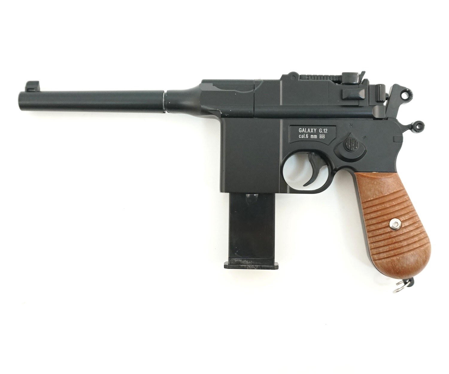 Galaxy G.12 — качественная спринговая страйкбольная модель классического пистолета Маузер, изготовленная из качественного цинкового сплава и пластика. Начальная скорость выстрела шарика 60-69 метров в секунду.