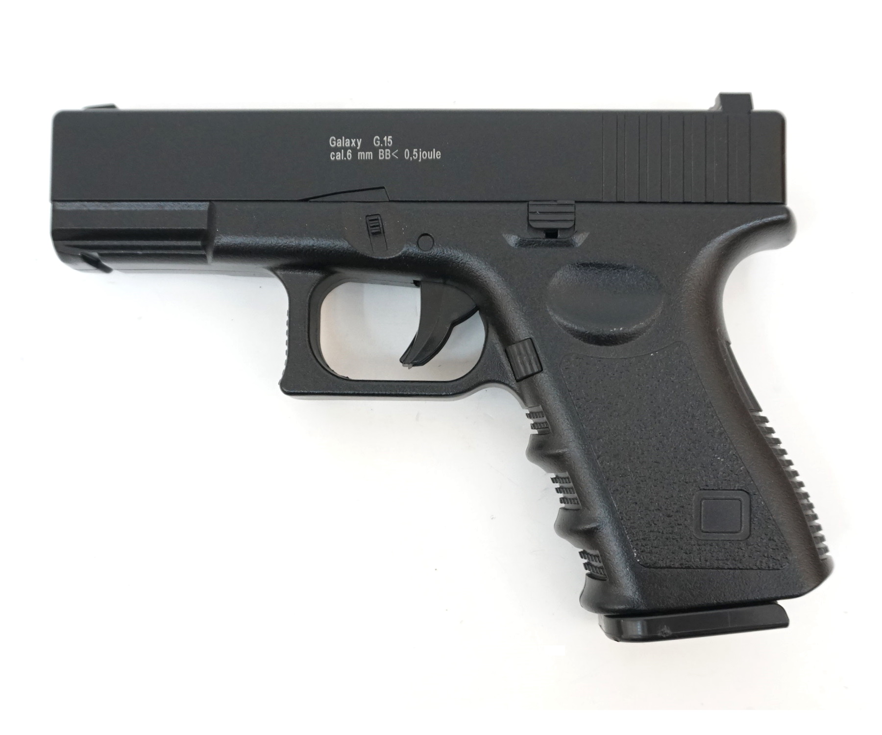 Galaxy G.15 — качественная спринговая страйкбольная модель классического пистолета Glock 17, изготовленная из качественного цинкового сплава и пластика. Начальная скорость выстрела шарика 70-79 метров в секунду.