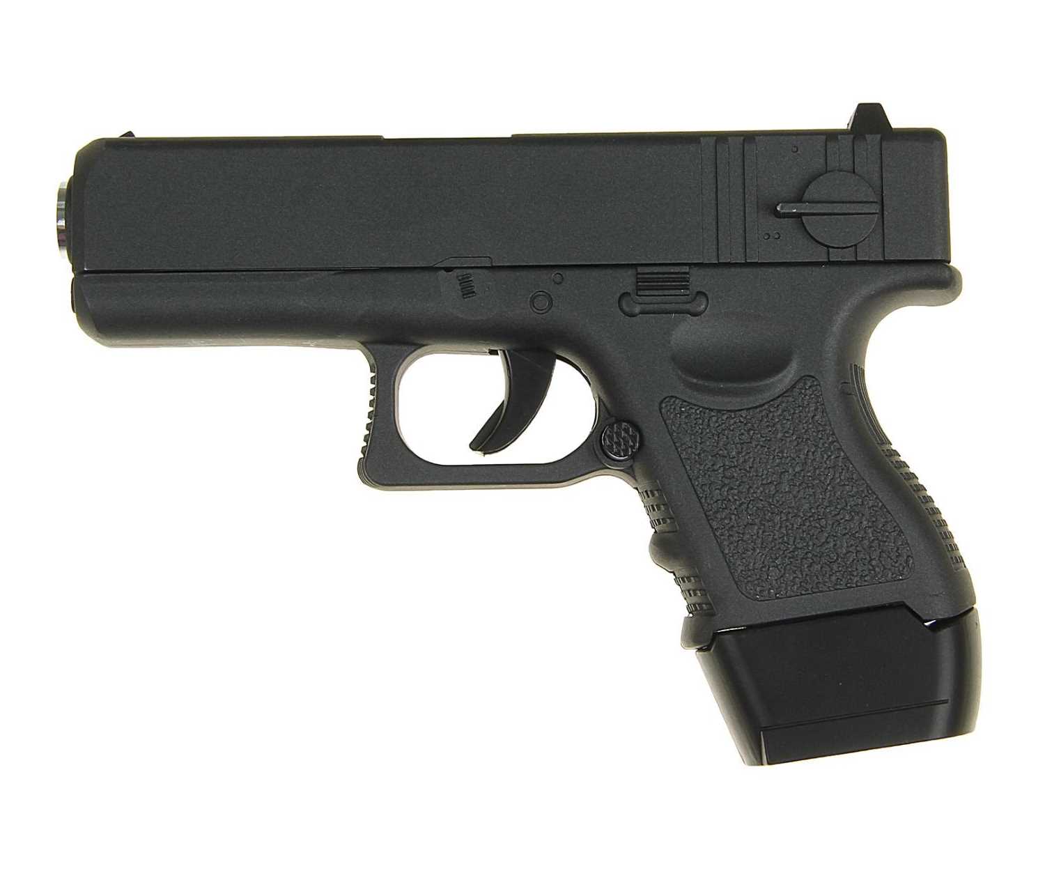 Материал модели – оцинкованный сплав металла и ABS-пластик, который и обеспечили небольшой вес модели – всего 286 г. Благодаря этому игровой Глок 17 является более удобным в переноске, а также позволяет комфортно вести прицельную стрельбу по различным целям одиночными выстрелами. Высокое удобство последнего обеспечивает также отлично повторенная тайваньцами оригинальной рукояти модели, которая предназначена полностью повторять анатомические характеристики руки пользователя.