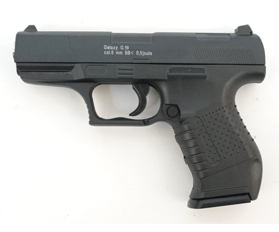 Galaxy G.19 — качественная спринговая страйкбольная модель классического пистолета Walther P99, изготовленная из качественного цинкового сплава и пластика. Начальная скорость выстрела шарика 60-69 метров в секунду.