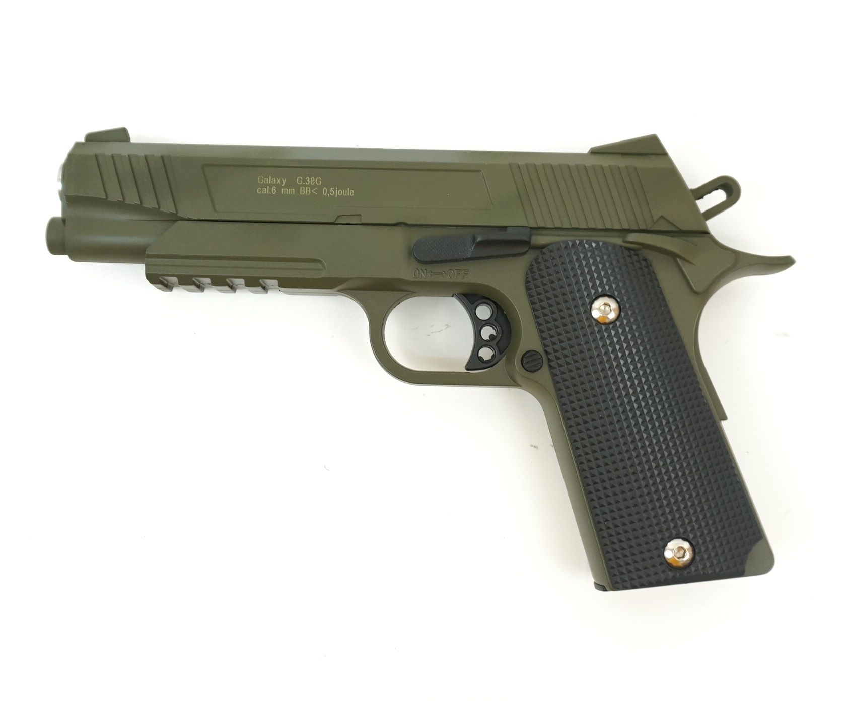 Страйкбольный пистолет Galaxy G.38G (Colt 1911), зеленый – это пневматическая спринговая версия знаменитого Кольта М1911, разработка азиатского бренда. Изделие отличается одиночным режимом стрельбы и использует шарики ВВ. Магазин пистолета вмещает 12 боеприпасов. Мощность пистолета Галакси Г.38 невысокая – всего 0,5 Дж. Скорость выстрела – в пределах 50-59 м/с.
