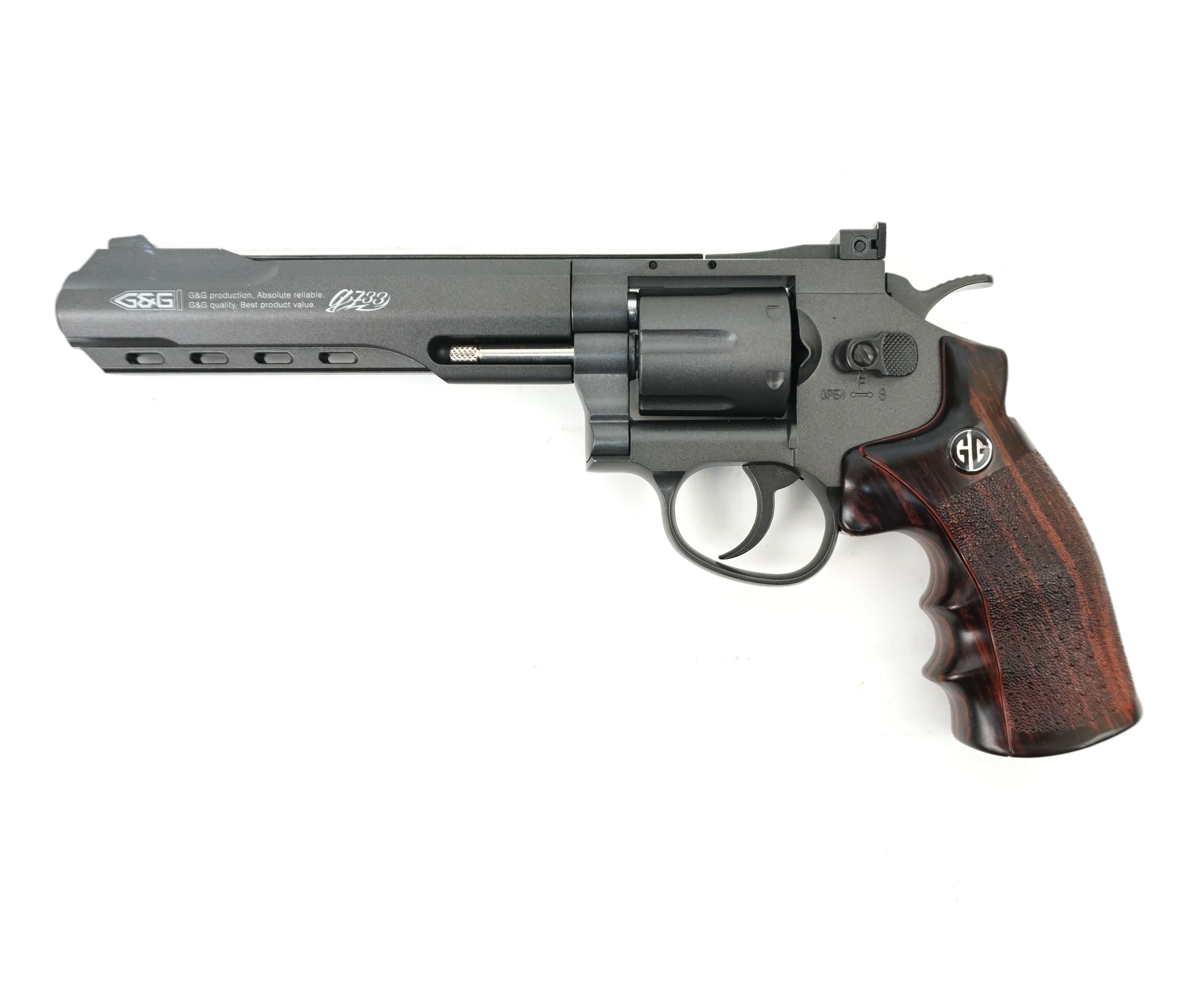 Револьвер G&G G733 BK, имеющий корпус из алюминия и пластиковую рукоять, использует в качестве привода двуокись углерода CO2. Порция газа выбрасывает из ствола шарик со скоростью 115-120 м/сек. Шарики снаряжаются в боеприпасы, имитирующие боевые патроны.