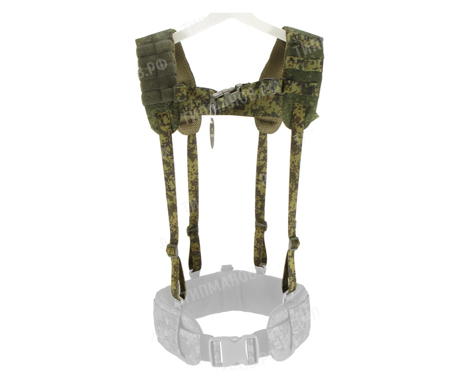 - Плечи усилены пенкой и имеют стропы MOLLE, что позволяет использовать пояс с суспендерами как полноценную РПС;