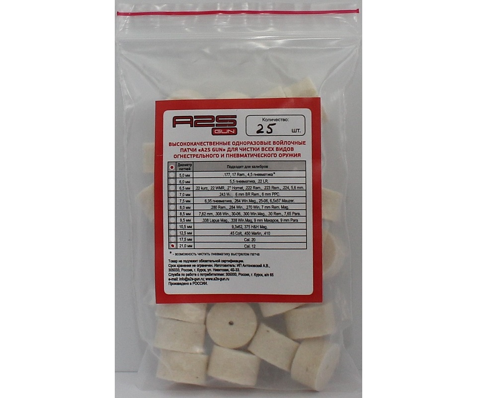 Главная Аксессуары и ЗИП для пневматики Наборы для чистки оружия A2S GUN (Россия) Войлочные A2S GUN патчи, Cal. 12, 25 штук