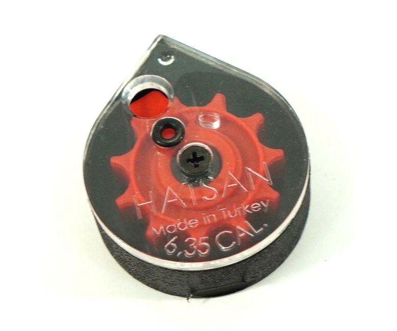 Запасной магазин барабанного типа для пневматических PCP-винтовок Hatsan Flash предназначен для заряжания пулями, калибра 6,35 мм, вместимость составляет 10 пуль.
