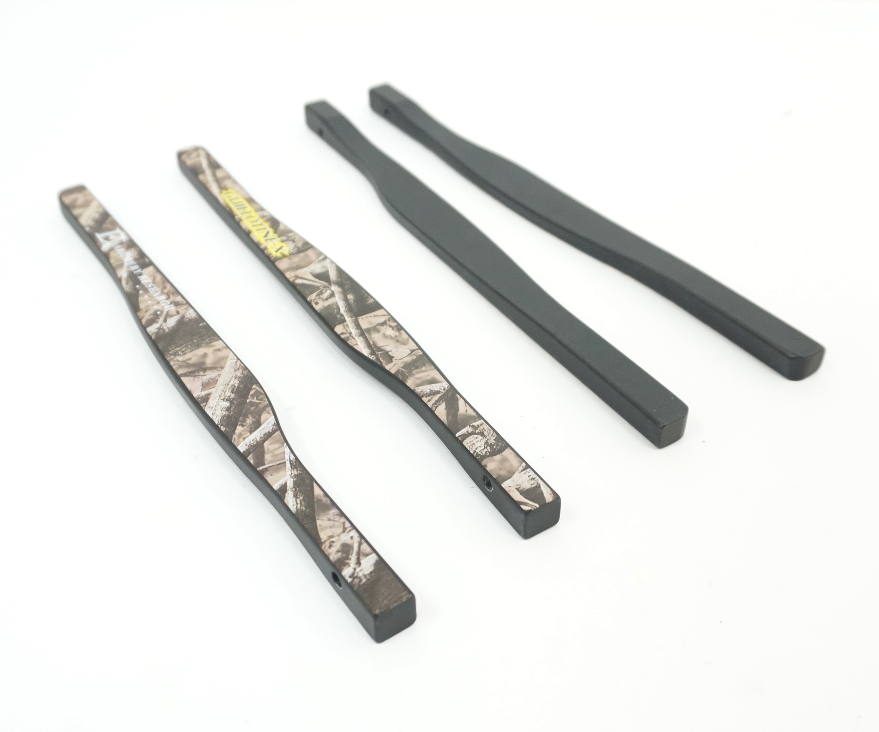 Заводские комплекты плечей имеют силу натяжения максимальную для каждой модели арбалета. Бывают двух видов. В сборе: вся передняя часть арбалета — удобна тем, что для замены требуется отгрутить только один винт. Планки отдельно: для замены необходимо разобрать систему блоков плеч, переставить планки и собрать назад.